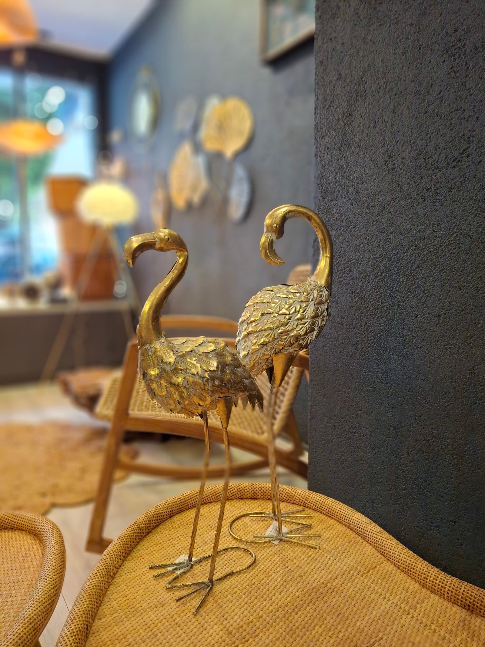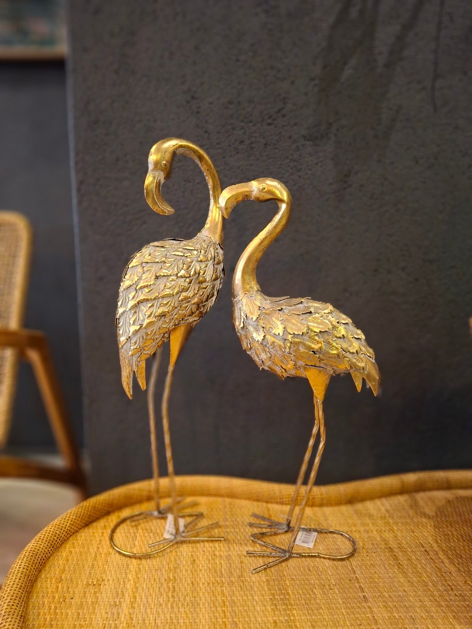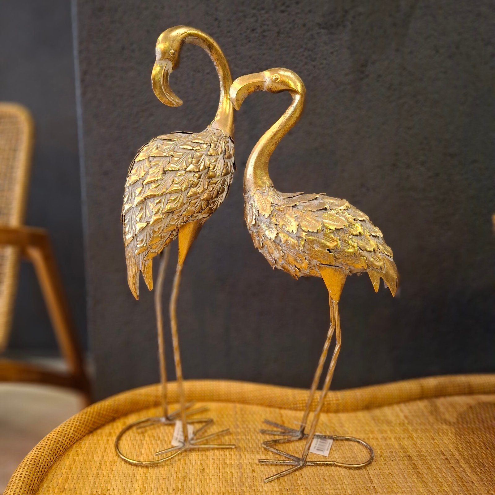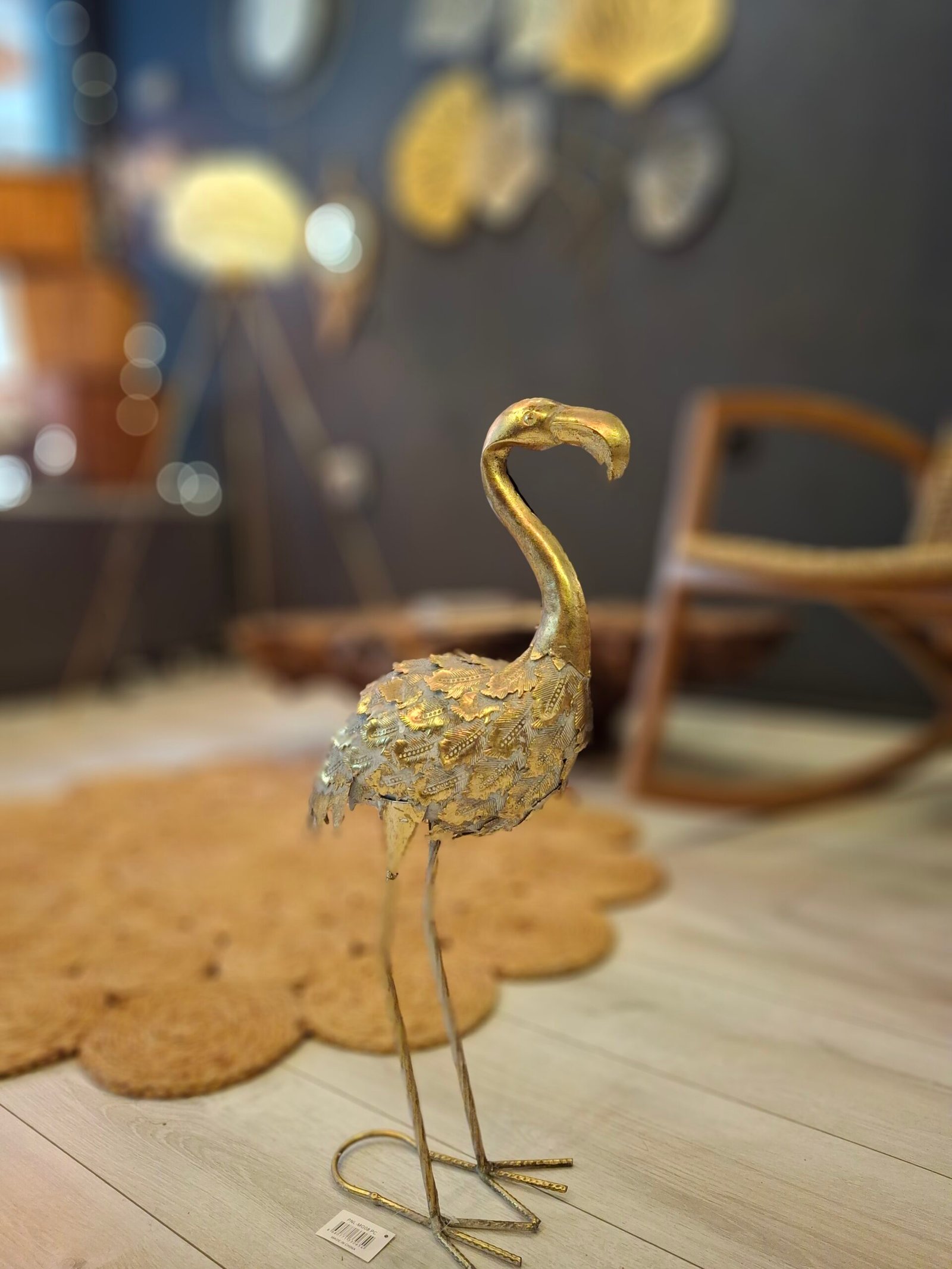 Zarafetiyle göz dolduran eskitme altın flamingo figürü, yaşam alanlarınıza estetik ve sofistike bir dokunuş katmak için tasarlandı.